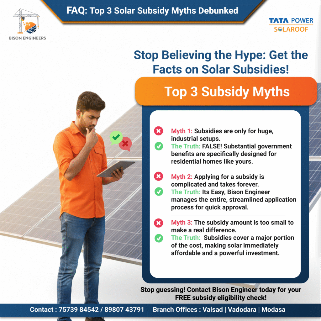 Stop Believing the Hype: Get the Facts on Solar Subsidies!Top 3 Subsidy MythsMyth 1: Subsidies are only for huge, industrial setups.The Truth: FALSE! Substantial government benefits are specifically designed for residential homes like yours.Myth 2: Applying for a subsidy is complicated and takes forever.The Truth: Its Easy, Bison Engineer manages the entire, streamlined application process for quick approval.Myth 3: The subsidy amount is too small to make a real difference.The Truth: Subsidies cover a major portion of the cost, making solar immediately affordable and a powerful investment.Stop guessing! Contact Bison Engineer today for your FREE subsidy eligibility check!Contact: 7573984542/89807 43791Branch Offices: Valsad | Vadodara |Modasa#bisonegineers#PMSuryaGharYojana#pmsuryagharmuftbijliyojana#solarenergy#solarsystem#vapi#vadodara#modasa